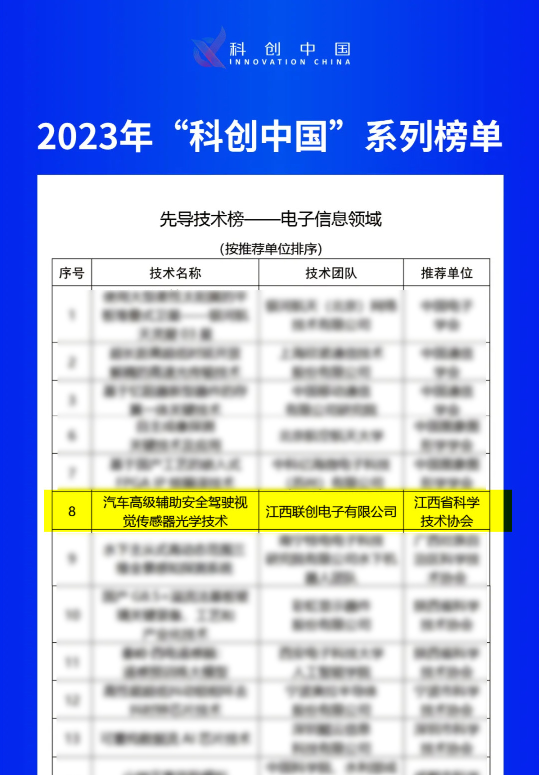 近日,中国科学技术协会公布了2023年度“科创中国”系列榜单遴选结果,QY千亿「中国」官方网站,的“汽车高级辅助安全驾驶视觉传感器光学技术”成功入选电子信息领域先导技术榜。
